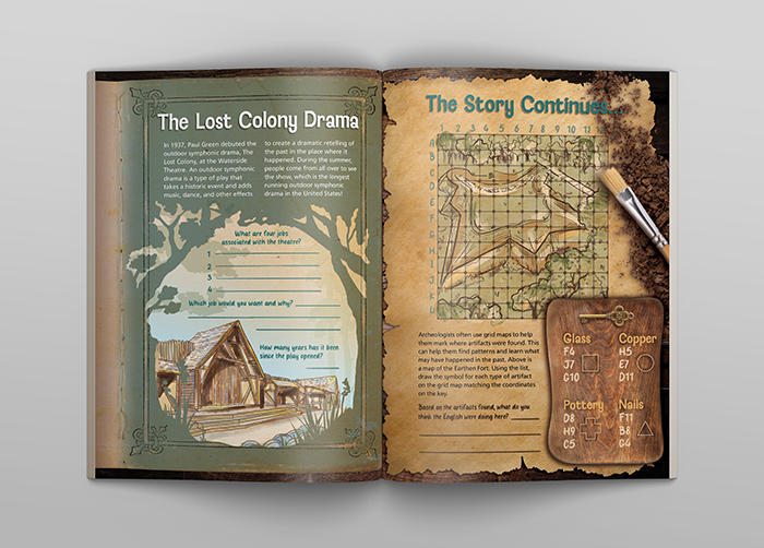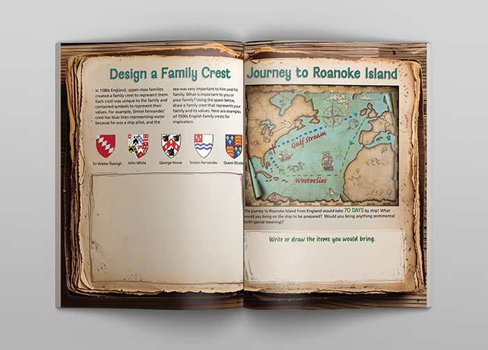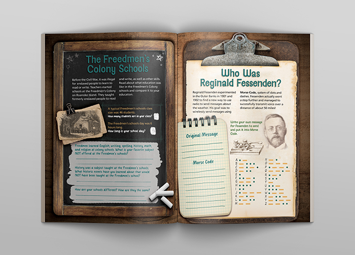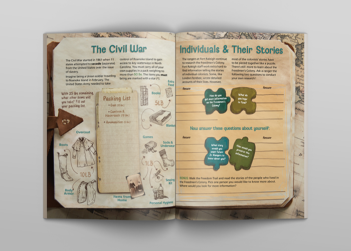 Rich textures, accrurate artifacts and custom illustrations combine to invite the viewer to explore the rich history of the Fort Raleigh Natiional Historic Site. The layering of elements and graphic embellishments give the layouts dimension and turn a flat page into an engaging display.