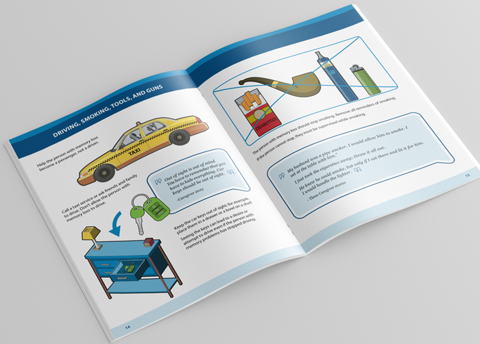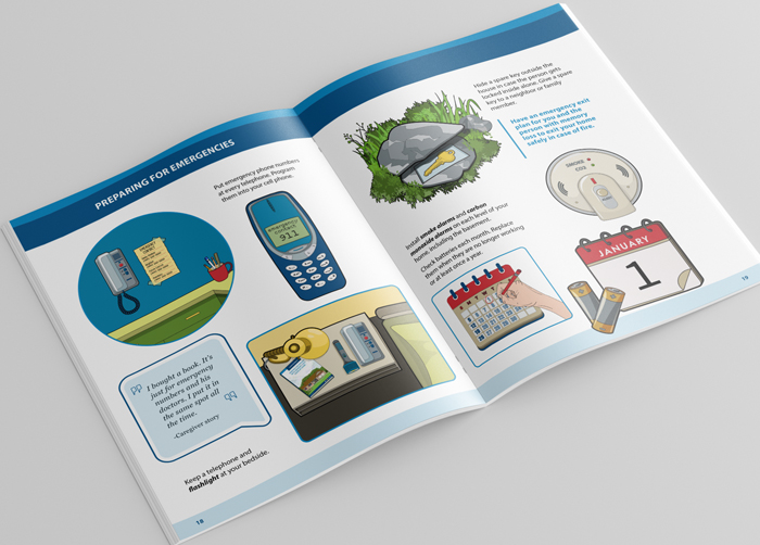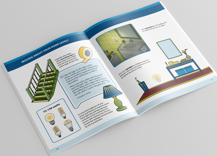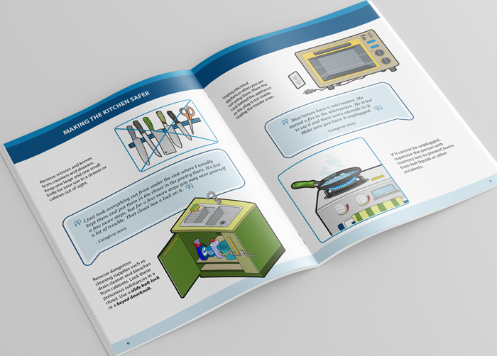 This guide, created for the Los Angeles VA, provides detailed home-safety guidance for people who care for persons with memory loss. The illustrations throughout are custom, original art, created with careful attention to details to accurately depict items and scenarios for each safety measure.