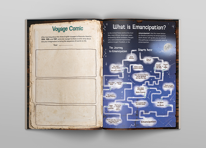 Rich textures, accrurate artifacts and custom illustrations combine to invite the viewer to explore the rich history of the Fort Raleigh Natiional Historic Site. The layering of elements and graphic embellishments give the layouts dimension and turn a flat page into an engaging display.