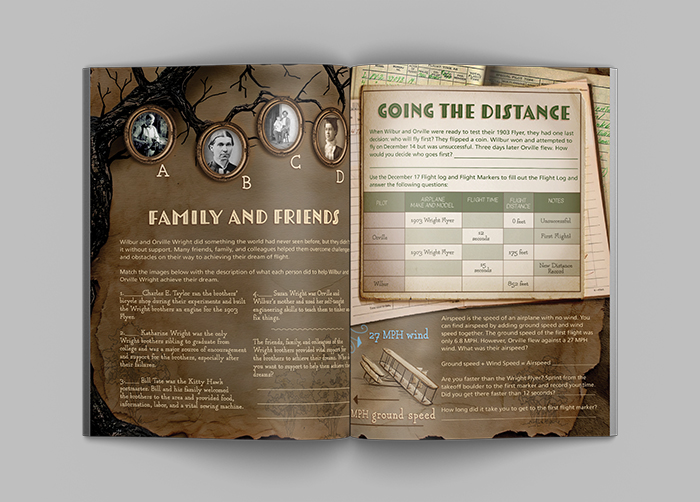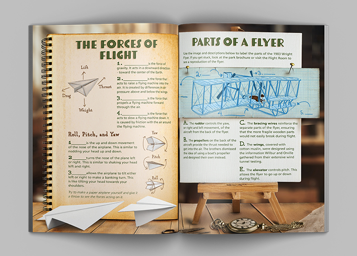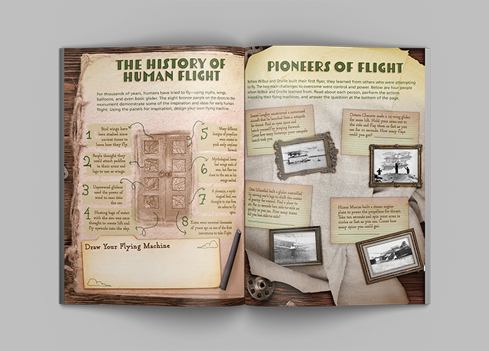 Activities through this Junior Ranger Book are designed to be inviting for youth, while still carrying the rich history and journey of the Wright Brothers. The layering of textures and elements give dimension and engage the viewer.
